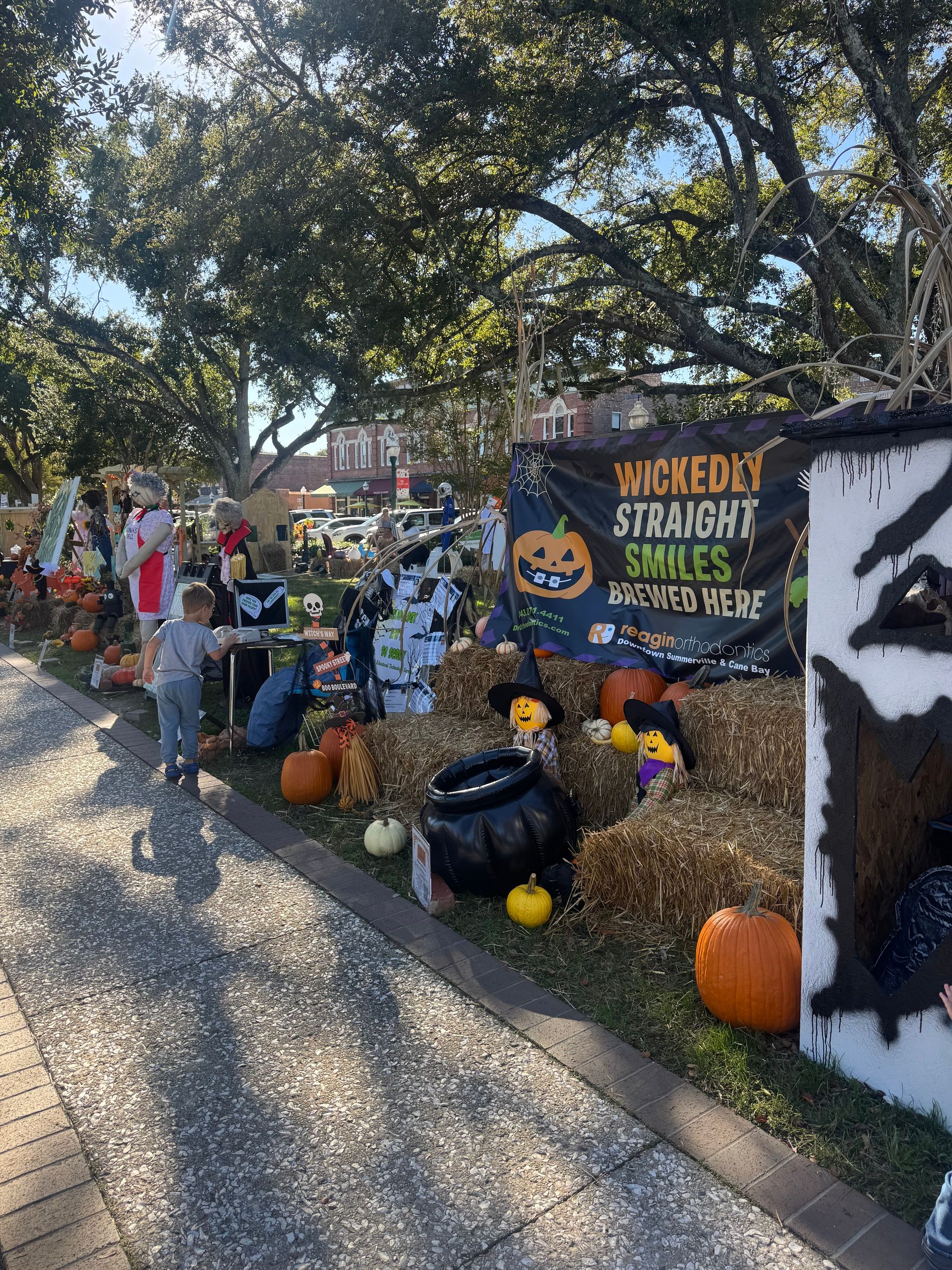 I took my boys to see the displays on a random Wednesday afternoon, and even though it wasn’t crowded, there were plenty of families strolling around, pointing out their favorites, and taking photos together. What I love most is how all ages get into it. I saw toddlers giggling at the silly skeletons, elementary kids carefully choosing their favorites, and even a teenage boy asking his dad to stop for their annual photo. It’s a small-town moment that captures everything special about Summerville in the fall.